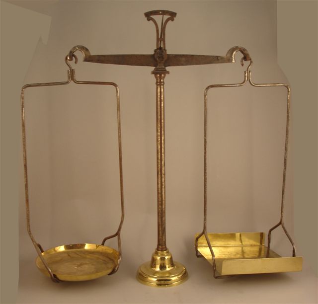BALANCE de pesage en fer forgé. La base circulaire en bronze. Les plateaux en tôle de laiton, l'un circulaire, l'autre carré. Éléments anciens. Haut. 94 cm (fléau restauré)