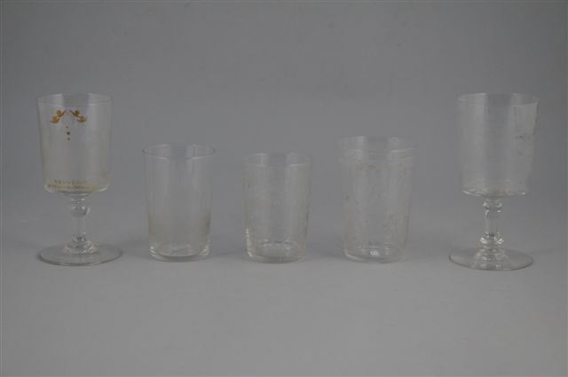 LOT comprenant TROIS GOBELETS en cristal gravé. Le premier représentant la Porte monumentale de l'Exposition Universelle de Paris 1900, le second à décor de palmettes feuillagées, le troisième à décor floral "Souvenir". Deux VERRES à pied en cristal, l'un "Souvenir de première Communion", l'autre "Souvenir de Baccarat, frontière de l'Est"