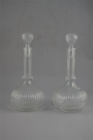 PAIRE de CARAFES en verre moulé incolore, le corps bulbiforme godronné à long col.