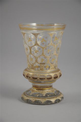 VERRE à pied en demi-cristal, peint blanc et or, à la manière du verre doublé, le pied et la paraison repris à la meule. Semis de fleurs et filets or.