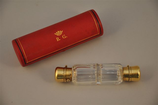 Curieux FLACON double en cristal taillé à pans, les réceptacles accolés, bouchons en argent uni doré à charnière, l'un gravé du monogramme BG, l'autre gravé d'une couronne de Marquis. Dans son écrin cylindrique en maroquin rouge à filets noir et or au même monogramme surmonté d'une couronne de Marquis, de la Maison MAC HENRY et PARDONNEAU Joailliers Bijoutiers au 18, rue Royale St Honoré à Paris. XIXème. Long. 15, Diam. 4 cm (petit choc à un bouchon).