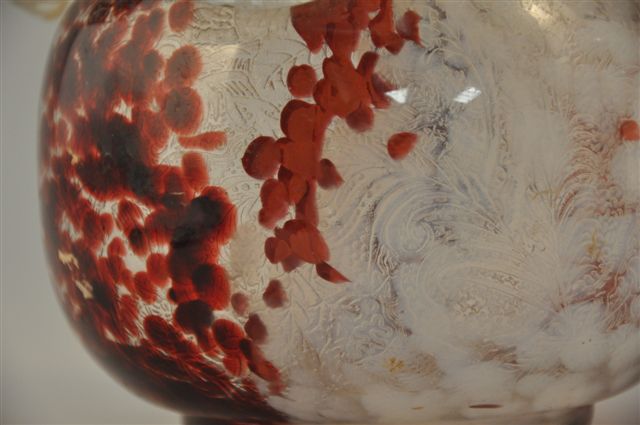VASE de forme boule en verre soufflé et gravé de motifs végétaux, le col déchiqueté travaillé à la pince formant une croix , irisé en rouge et en blanc, décor de rinceaux fleuris dorés sur les angles. Haut. 13,5, Diam. 16,5 cm. (éclats)