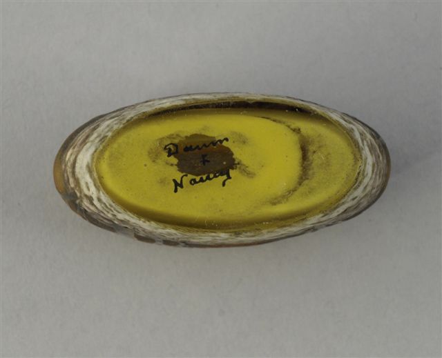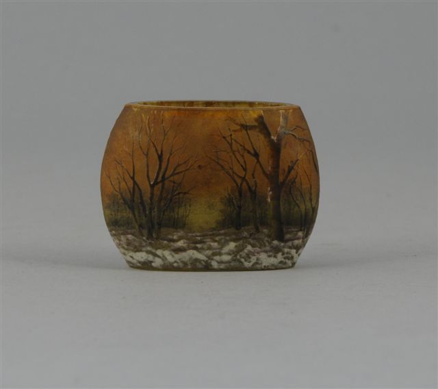 DAUM. VASE de forme gourde en verre gravé à l'acide de deux couches, peint et émaillé d'un paysage de neige. Signé sous la base DAUM Nancy, ave la croix de Lorraine. Haut. 4 cm.