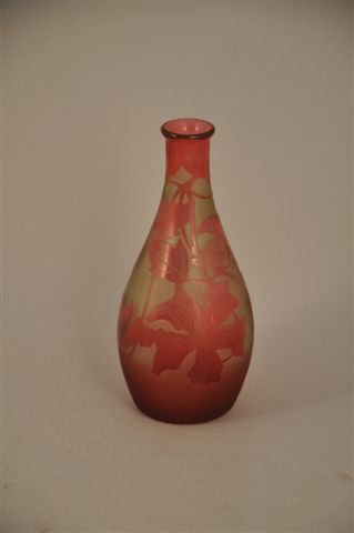 D'ARGENTAL. VASE piriforme en verre double couche dégagée à l'acide à décor de clématites de couleur grenadine, sur fond incolore.