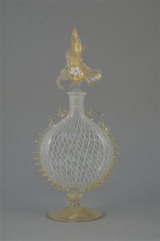 VENISE ou MURANO. FLACON en verre soufflé reposant sur un pied circulaire pailleté d'or, le corps en forme de gourde aplatie à motifs filigranés formant une résille, appliqué latéralement à chaud forment deux petites anses à l'épaulement. Bouchon pailleté d'or, travaillé à chaud ornée de trois fleurs stylisées.