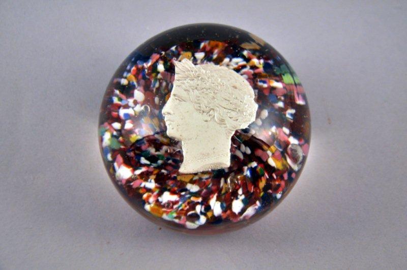 PRESSE-PAPIERS SULFURE en verre, ornée d'un profil argenté couronné de lauriers sur un semi de fleurs