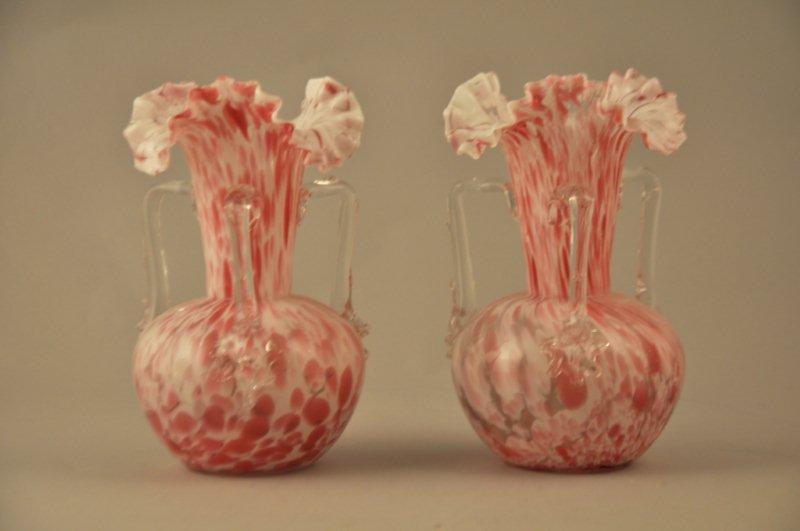 PAIRE DE VASES À TROIS ANSES en verre blanc teinté de rose, panse ronde et col en dentelle.