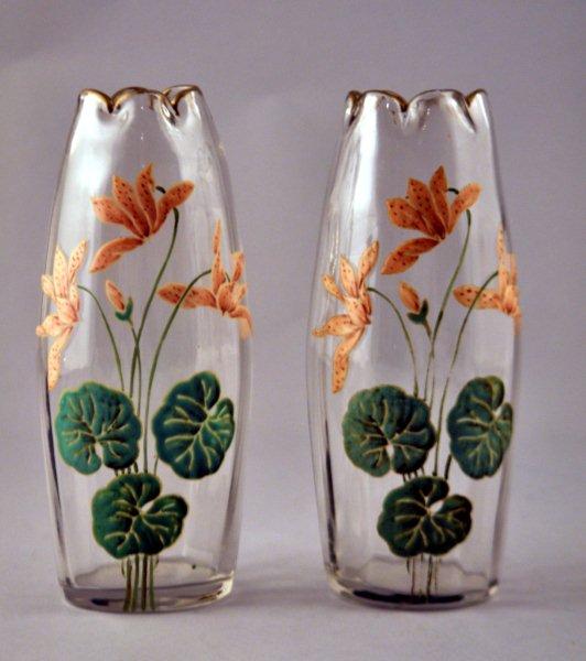 PAIRE DE VASES À COL PINCÉ en verre, à décor émaillé peint de fleurs grimpantes, col pincé en six bulbes et doré.