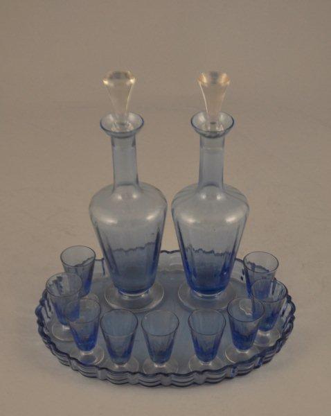 SERVICE À LIQUEUR en verre teinté bleu et blanc comprenant un plateau ovale à bord mouvementé, deux carafes fuseau sur pied et leur bouchon, neuf petit gobelets sur pied.