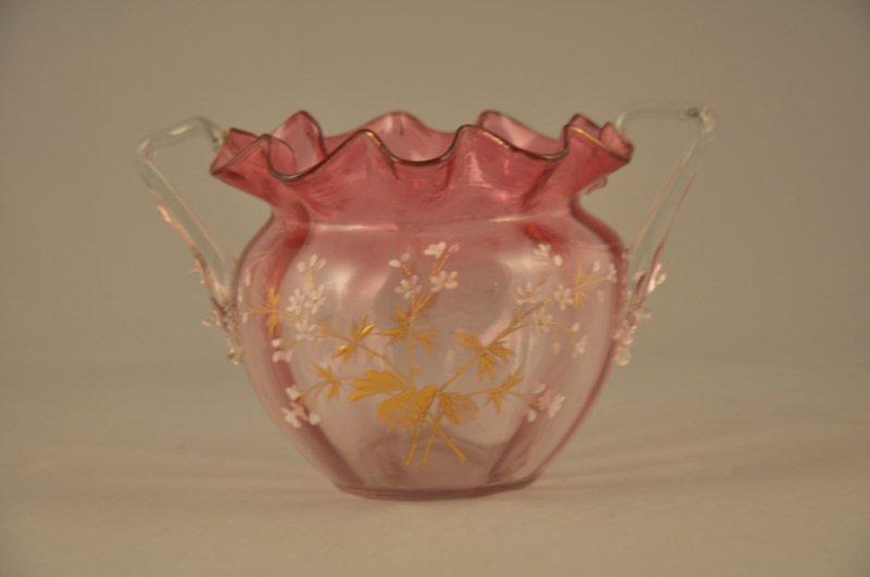VASE BOURSE À ANSES en verre transparent teinté de rouge, à décor émaillé de myosotis.