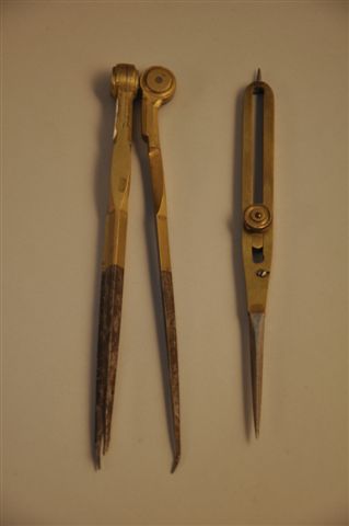 DEUX COMPAS en laiton et acier. Le premier de réduction et le second à trois pointes. XVIIIème. Long. repliée respectives: 16,5 et 17 cm (choc aux pointes du second)