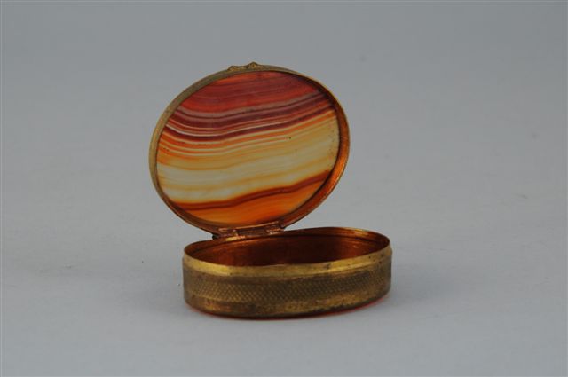 BOITE ovale en sardoine, fond et couvercle enserré dans une monture en métal doré à motifs de croisillons. XIXème. Haut. 2, Long. 6, Larg. 5 cm