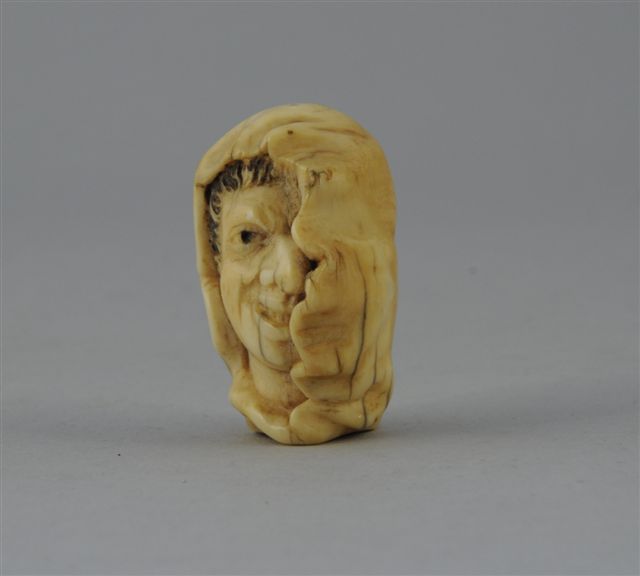 POMMEAU de CANNE en ivoire sculpté figurant une tête encapuchonnée, couverte sur un profil, allégorie de la nature humaine (?). Haut. 4,5 cm.