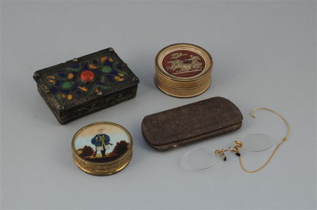Joint: boîte rectangulaire en métal, couvercle à charnière à décor émaillé ornée d'un cabochon en composition de couleur corail. Haut. 3, Long. 10, Larg. 7 cm. Boîte ronde en terre cuite à décor en bas relief d'un char sur le couvercle. Marquée en creux "P Ipsen Kjobenhave Eneret. ". Diam. 7 cm (éclats et accidents). Paire de bésicles à monture métal doré, dans leur étui.