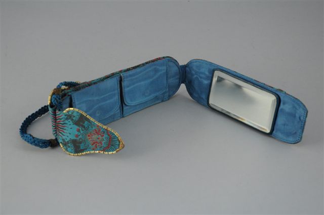 ETUI-POCHETTE de soirée en tissu broché or et rouge à fond turquoise, à motifs de cerfs affrontés. Miroir à biseau. Maison MEYROVITZ. 19 x 6 cm