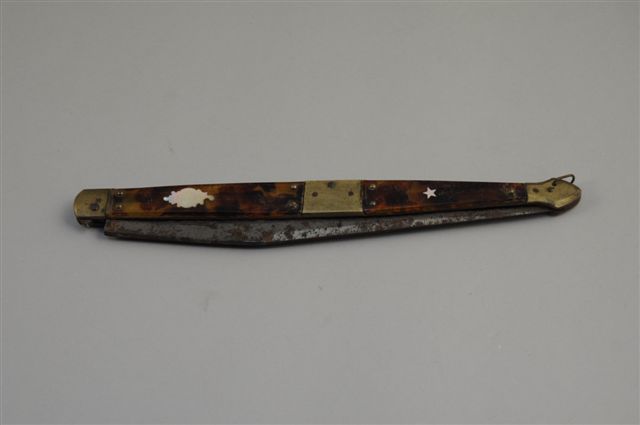 GRAND COUTEAU PLIANT manche en écaille, incrustration de nacre et monture en laiton. La lame marquée "COUT A RET". XIXème. Long. 44 cm. (piqûres sur la lame)