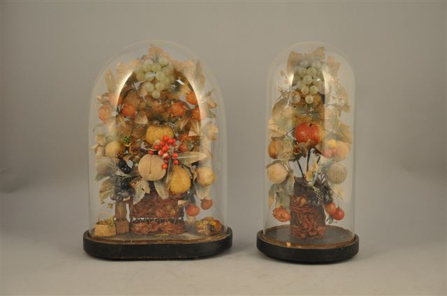 DEUX GLOBES en verre, l'un de plan circulaire, l'autre ovale. Base en bois noirci. Seconde moitié du XIXème. Composition artificielles de fleurs et de fruits. Haut. 44 cm
