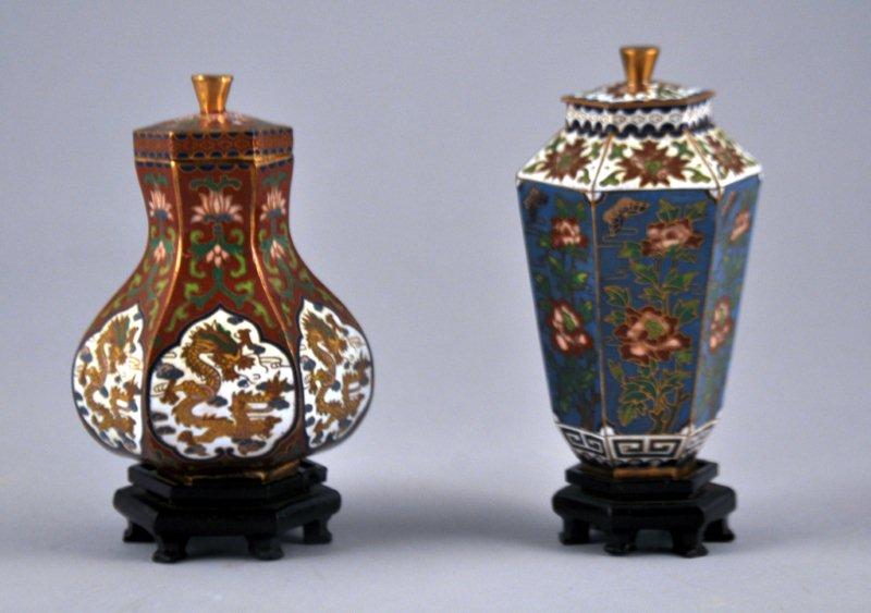Deux POTICHES COUVERTES À PANS en émail, à décors pour l'un de dragons dans des cartouches sur fond rouge et pour l'autre de fleurs stylisés et de frise géométrique sur fond bleu.