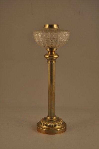 LAMPE À HUILE SUR COLONNE en bronze doré et verre moulé en cabochon par la maison "EVERED & CO LP" (manques).