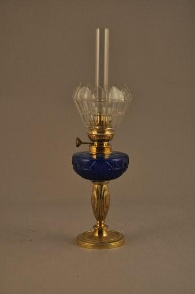 Petite LAMPE À HUILE sur colonne cannelée bombée en bronze doré et verre moulé à facettes teinté bleu pour le réservoir, découpé blanc pour le globe, reposant sur un socle circulaire en bronze doré. Marquée sur le bouton "Import Allemage" et "HS" dans un médaillon porté par un aigle.