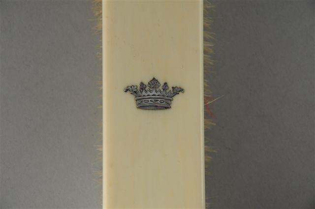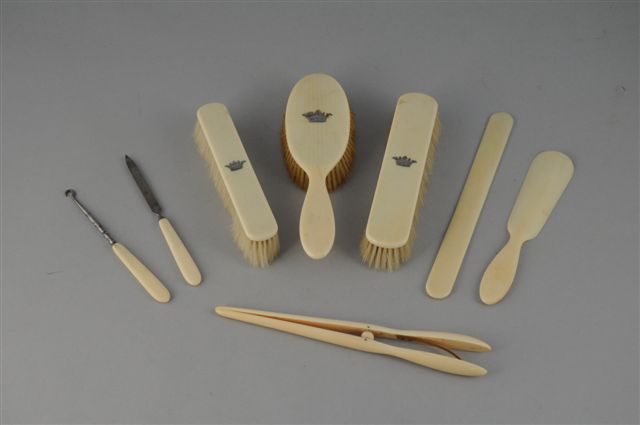 Ensemble de TOILETTE en ivoire 8 pièces comprenant deux brosses à habits, une brosse à cheveux, une pince à gant, un croche bottines, une lime à ongles, un chausse pied et un accessoire. Les brosses incrustées d'une couronne de marquis en argent gravé (petit accident et manque)