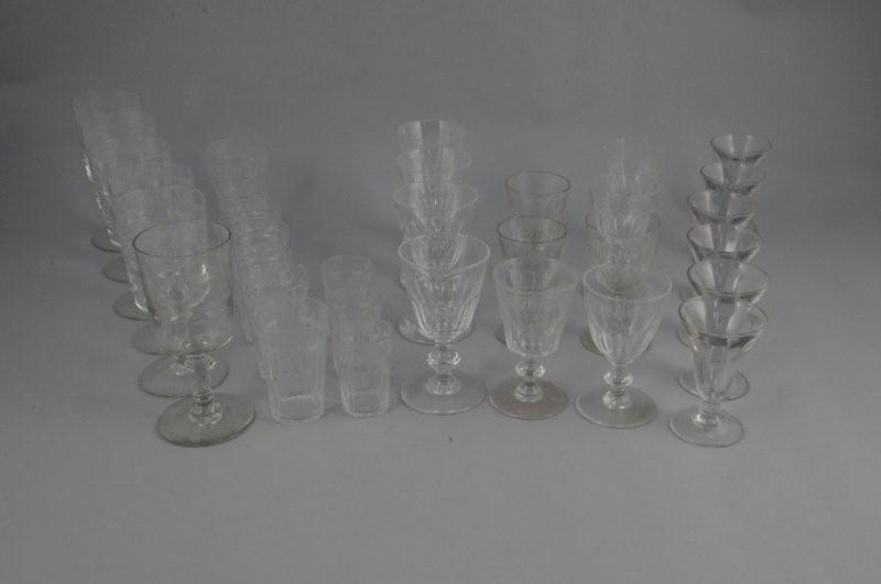 LOT de 33 VERRES comprenant: 10 VERRES à pied en cristal , la paraison taillées à pans (différents modèles et taille), 10 GOBELETS en cristal taillé à pans (deux tailles), suite de 6 VERRES de bistrot, suite de 5 VERRES à pieds gravés de grecques (accident) et divers (quelques éclats)