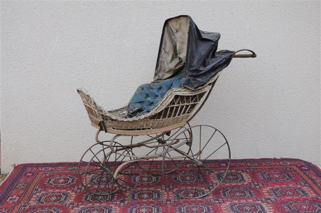 LANDAU en fer forgé, bois et osier. Deux essieux doubles à roues en fer. Capote rabattable en toile enduite. Poignée en bois. Partiellement laqué crème à filets rouge. XIXème. Haut. 102, Larg. 54, Long. 119 cm (en l'état)