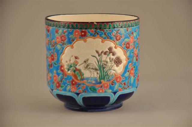 LONGWY. CACHE-POT CYLINDRIQUE AU HÉRON en faïence sur pied, à décor polychrome d'échassiers, de hérons et d'oiseaux en réserve sur fond blanc dans un encadrement de fleurs sur fond turquoise. Frise fleurie au col et pied godronné alternant bleu et nuit et turquoise (col restauré).