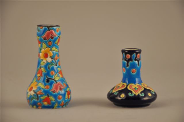 LONGWY. PAIRE DE PETITS VASES À COL en faïence, à décor de fleurs polychromes sur fond turquoise pour l'un et d'une frise de coeurs stylisés jaunes sur fond bleu foncé pour l'autre.