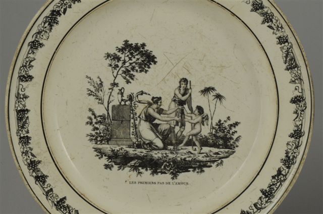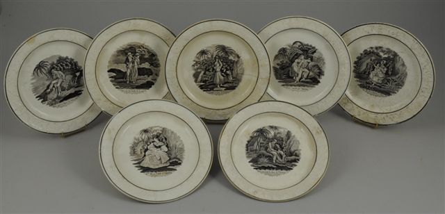 CHOISY. Paul et Virginie, d'après le roman de Bernardin de Saint Pierre. Série de 7 ASSIETTES en faïence fine. Aile en relief à motifs de rinceaux, lyres, vases et volatiles. Décor imprimé en nois dans le bassin. Marque en creux dans un écusson.