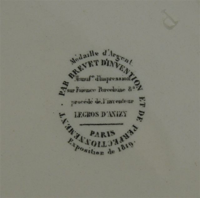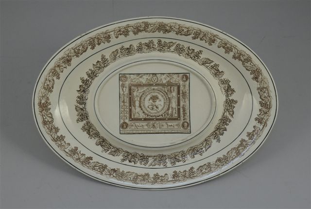 CREIL. PRESENTOIR ovale en faïence fine, le bassin en ressaut formant socle. Décor imprimé en sépia, sur l'aile et le marli, d'une double frise de pampres de vigne. Au centre, sont représentés trois putti dont l'un porte une corbeille de fleurs, entourés de deux figures allégoriques de Minerve ou la Moisson (?), encadrement à candélabres latéraux d'inspiration "grotesques", avec, au centre en partie supérieur, trois fleurs de lys couronnées. Filets noirs. Marque en creux "CREIL" et cachet en noir "Médaille d'argent (...) Exposition de 1819"