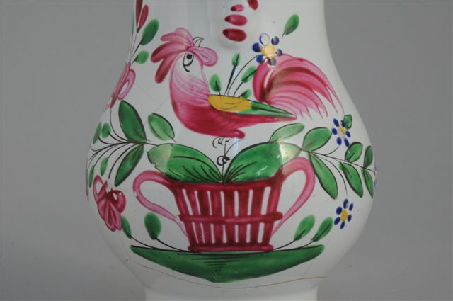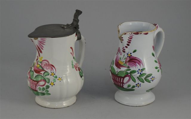 EST de la FRANCE. DEUX PICHETS ventrus en faïence à décor d'un coq sur un panier dans un entourage floral. Le premier portant une marque-cachet en bleu, XIXème, Haut. 23,5 cm (accidents, restaurations et manques). Le second couvert, à côtes melon, Haut. 19 cm (fêles dans le fond)