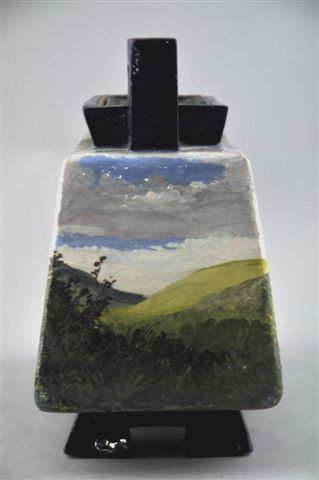 JARDINIÈRE À ANSES PAR MÉNARD en céramique impressionniste à la barbotine de forme carrée reposant sur un pied découpé et décorée sur les quatre faces. Sur l'une, décor champêtre avec trois vaches, une charolaise, une normande et un hollandaise. Au deuxième plan, une fermière avec trois autre vaches et au fond la mer sous un ciel bleu nuageux. Une autre face est agrémentée d'un chemin traversant des champs vallonnés se terminant sur la mer avec, au premier plan, des arbres et des haies. Bassin de tôle. L'intérieur de la jardinière est de couleur ocre-marron si spécifique aux ateliers d'HAVILAND à Auteuil. Signé "Ménard".