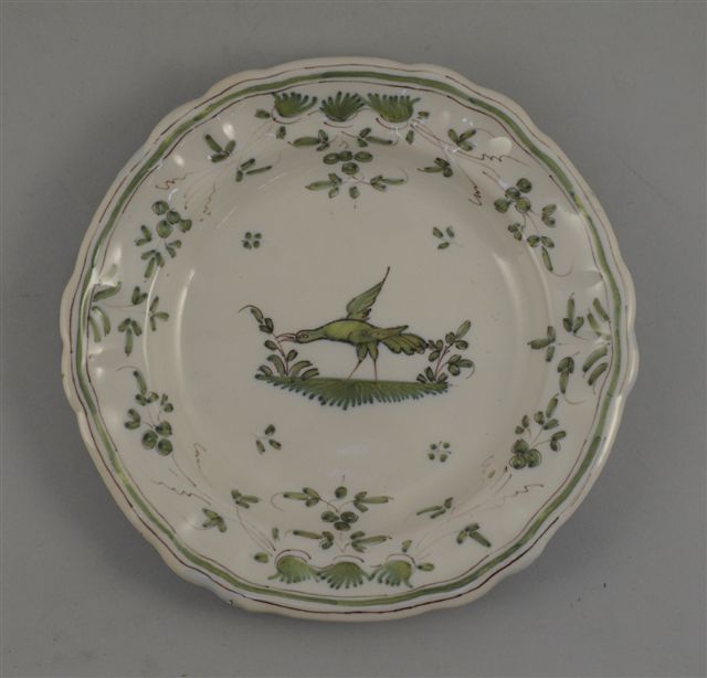 MOUSTIERS (dans le genre de). Petit PLAT rond en faïence de grand feu à décor en vert sur tracé manganèse d'un volatile sur un tertre. Aile chantournée à décor de fleurs stylisées. Marqué d'une croix au revers. Diam. 27,5 cm.