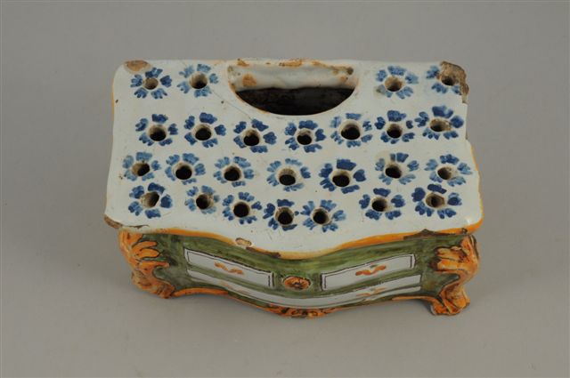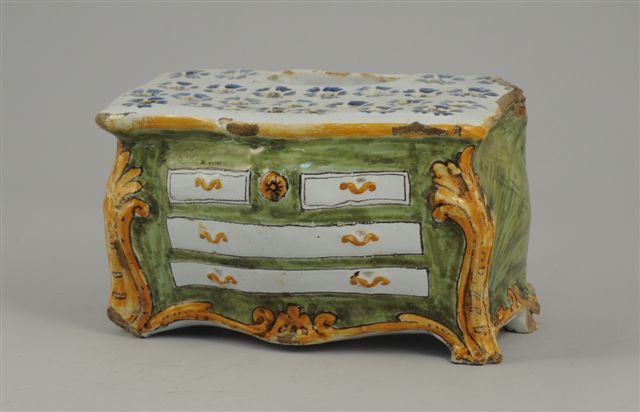 NEVERS.COMMODE-BOUQUETIÈRE en faïence de grand feu ocre, vert, bleu et filets manganèse, de forme Louis XV.