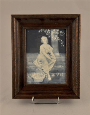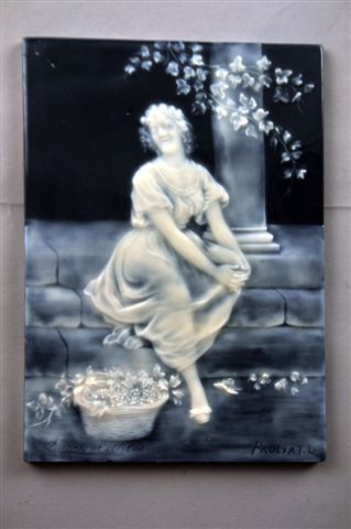 VARIA. PLAQUE RECTANGULAIRE en faïence à l'imitation de Wedgwood, à décor blanc sur bleu d'une jeune bacchante vendageant. Signé en bas à droite "PAULIAT L." "d'après E. Blas".