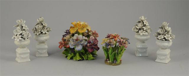 ITALIE. LOT comprenant une suite de quatre VASES FLEURIS en céramique blanche (Haut. 17 cm), deux CENTRES DE TABLE "bouquet de fleurs" en céramique polychrome napolitaine. Haut. 13 et 15 cm (éclats et manques)