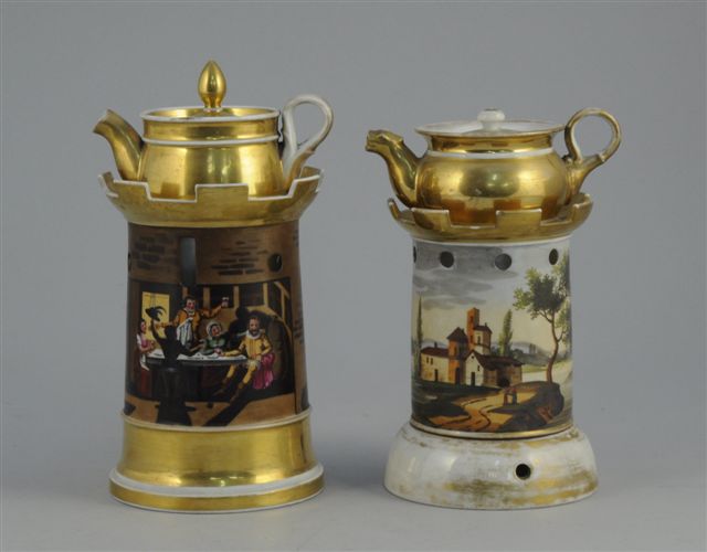Joint: VERSEUSE de tisanière en porcelaine dorée, se rapportant sur l'élément du premier niveau. BASE de tisanière se rapportant sur l'élément du second niveau.