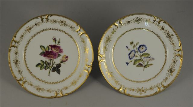 PARIS. LOT comprenant: DEUX ASSIETTES formant paire à décor peint en polychromie, dans le bassin, pour l'une, de roses sauvages, pour l'autre, de volubilis, le marlis et l'aile à fines frises florales or, bordure lobée à filet or. Marquées Leblanc. (Diam. 22,5 cm, éclat et fêle, deux égrenures). PLAT à bordure lobée dorée de motifs feuillagés, les anses à motifs en reliefs de fleurs en corolles, monogrammé RD à l'or. (Diam. 27,5 cm).