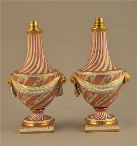 PARIS. PAIRE DE VASES BALLUSTRES en porcelaine montés à l'électricité, à décor torsadé roses et blanc rehaussé d'or et de fines roses polychrome sur des réserves blanches. Col à godron torsadé, anses à têtes de lion dorées réunis par des draperies dorées sur fond blanc, pied torsadé reposant sur un socle carré.