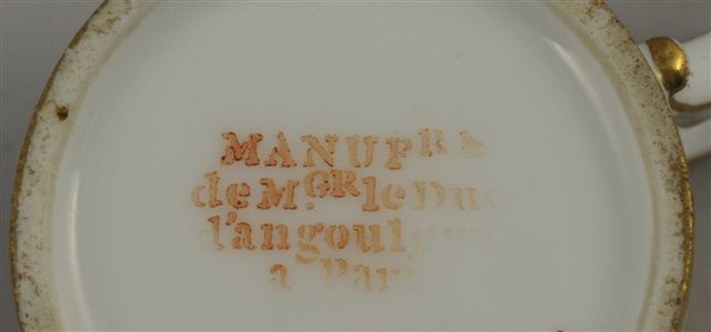 PARIS. Tasse et sous-tasse en porcelaine à décor de guirlandes feuillagées. Marquée "manufacture de M.gr le Duc d'Angoulême à Paris". (fêle et égrenures à la sous-tasse).