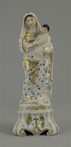 PARIS. VIERGE à L'ENFANT en porcelaine à décor doré, le manteau semé d'étoiles de couleur bleu. Milieu XIXème. Haut. 24 cm. (petit éclat au socle).