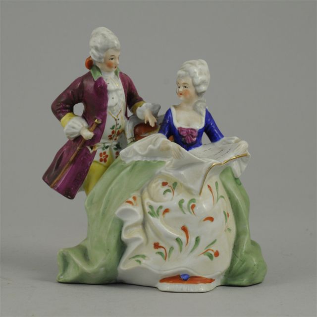 Joint: COUPLE DE PERSONNAGES en porcelaine polychrome, vêtus à la mode du XVIIIème. XXème. Haut. 16,5, Larg. 14 cm.