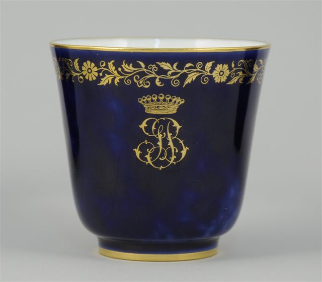 Comprenant une cafetière, un sucrier, un pot à lait, une suite de six tasses à corps légèrement évasé, et leurs sous-tasses. Fond bleu nuagé, décor or de frises florales et monogramme "SB" surmonté d'une couronne comtale. Marques de forme de 84 à 89. Marque de dorure pour 1890.