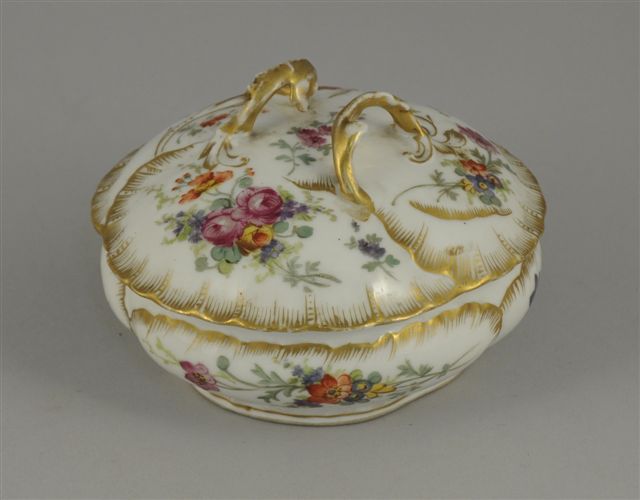 VARIA. BONBONNIERE ronde en porcelaine à corps et couvercle trilobé. Décor peint de fleurs, prise du couvercle double en feuillage. Haut. 9 cm