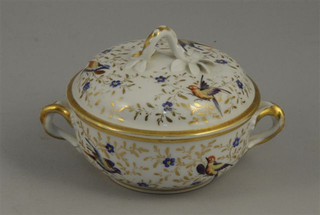 VARIA. BOUILLON couvert en porcelaine à décor peint d'oiseaux polychromes sur fond de branches fleuries or. Anses latérales et prise du couvercle en branche feuillagée . Fin XIXème. Haut. 11, Diam. 13,5 cm.