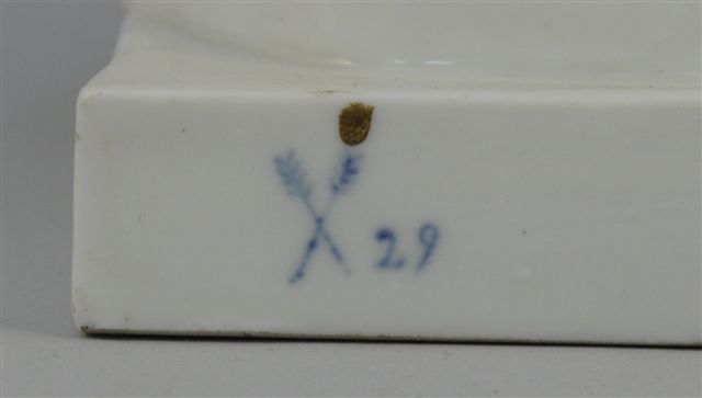 Élégante à l'éventail. Porcelaine. Signée en creux et marque aux flèches croisées en bleu "29"