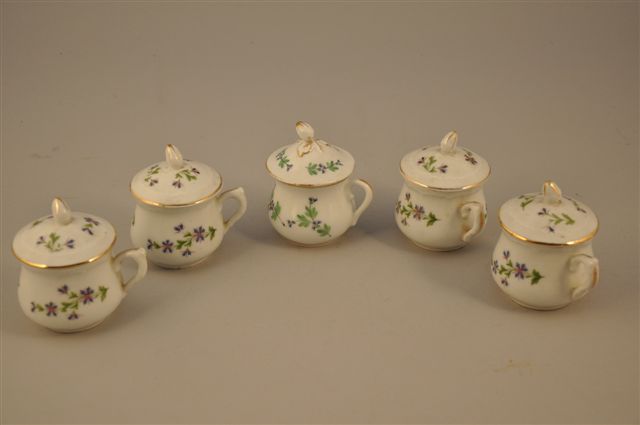 VARIA. SUITE de QUATRE POTS à CRÈME en porcelaine, à décor aux barbeaux, le couvercle orné d'une fleur en bouton, réhauts d'or. Haut. 10, Diam. 6 cm.