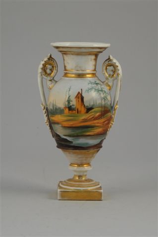 VARIA. VASE de forme balustre en porcelaine. Décor polychrome peint , sur une face, d'un couple, et, sur l'autre face, d'une construction dans une perspective paysagée. Anses latérales à enroulement feuillagé centré d'un masque de femme.