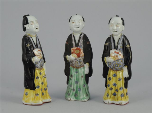 CHINE ou JAPON. TROIS STATUETTES en porcelaine polychrome et ot représentant un homme tenant un éventail.